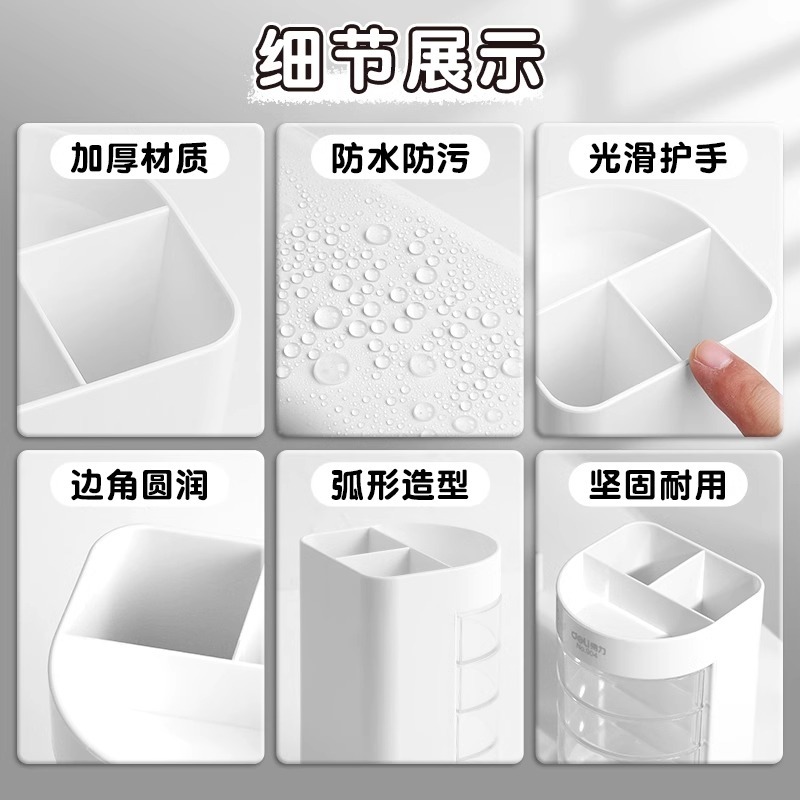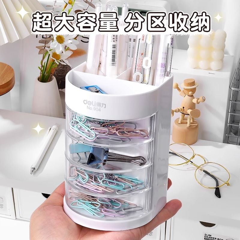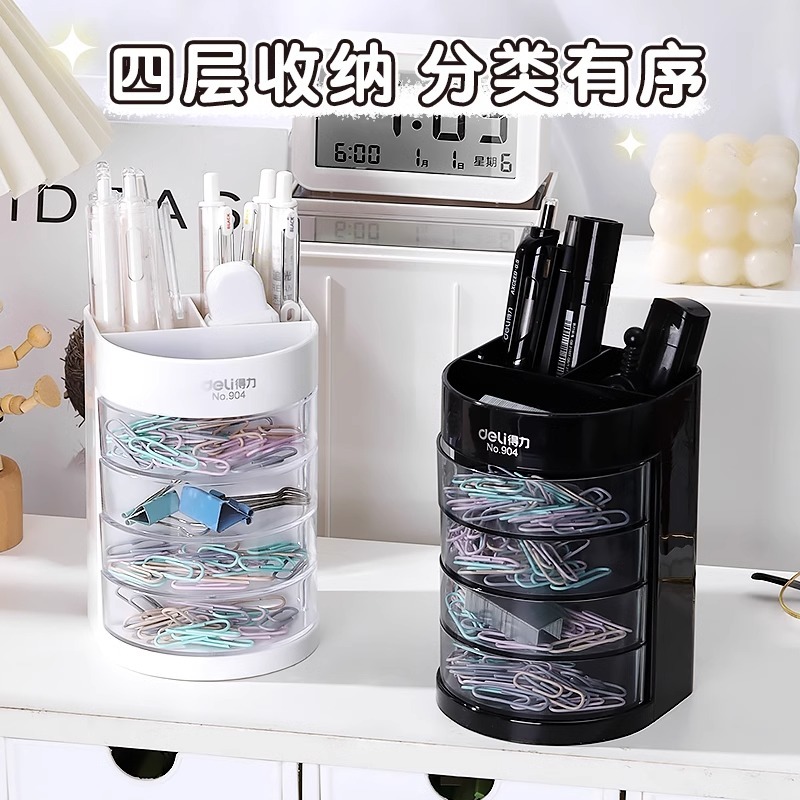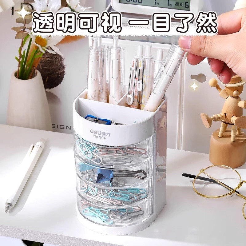 得力多功能笔筒办公商务四层分格笔筒收纳盒加厚透明大容量可视多层笔筒办公室桌面置物架时尚文具笔筒学生用