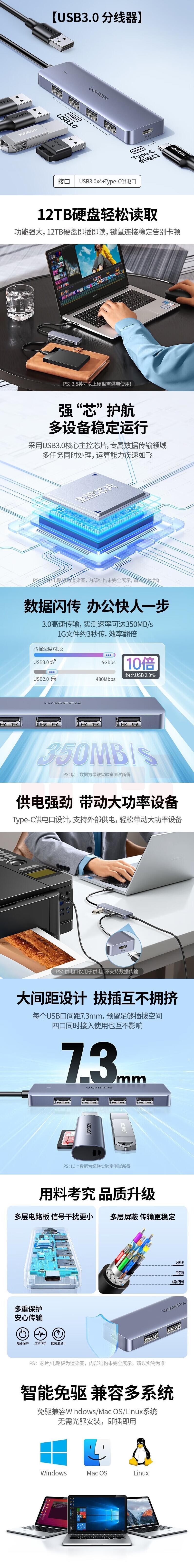 绿联 分线器 USB3.0 高速扩展4口HUB扩展坞1.5米集线器电脑一拖四多接口延长线 90879