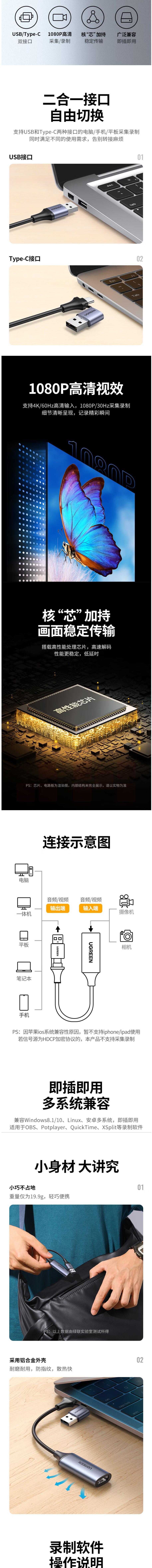 绿联 HDMI视频采集卡4K输入 适用Switch/PS5笔记本电脑手机相机 USB/Type-C双输出录制盒1080P采集