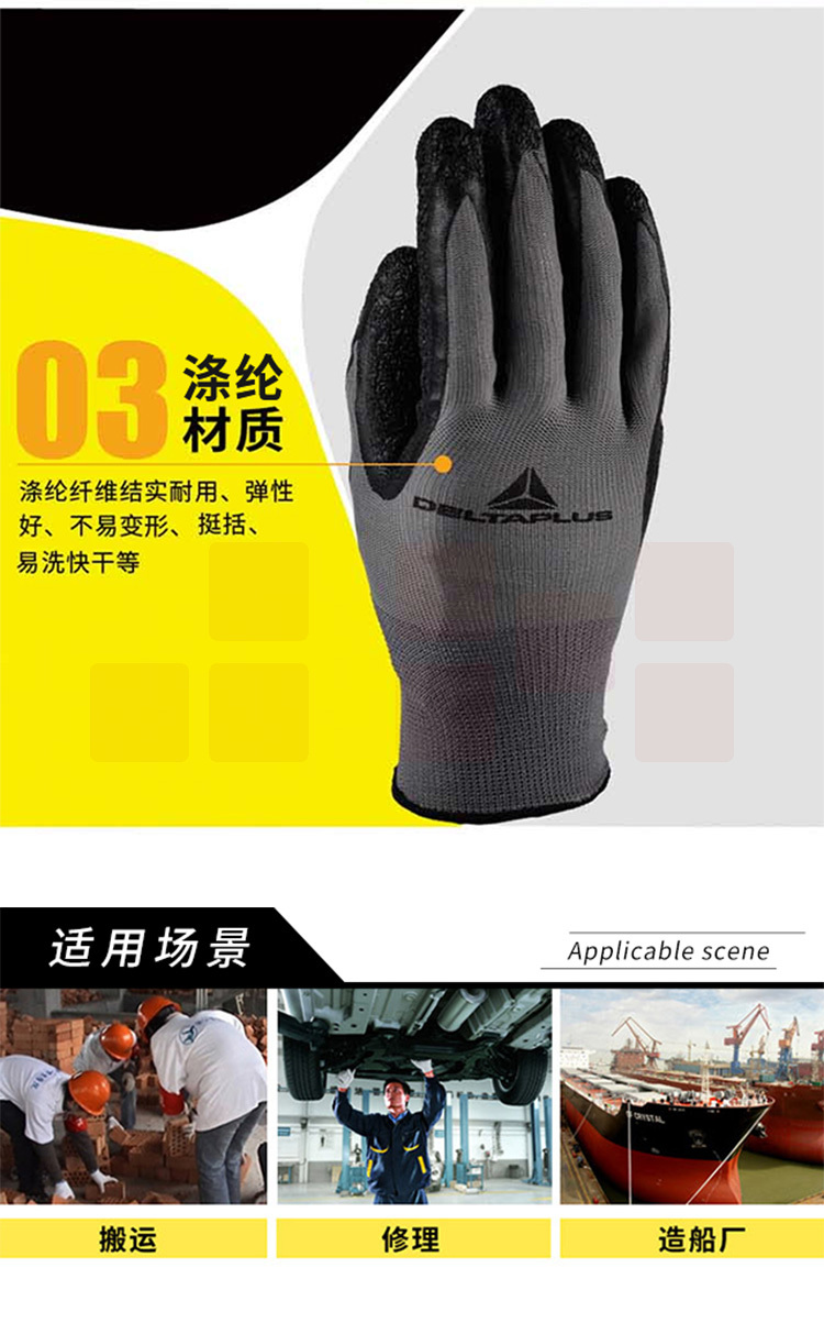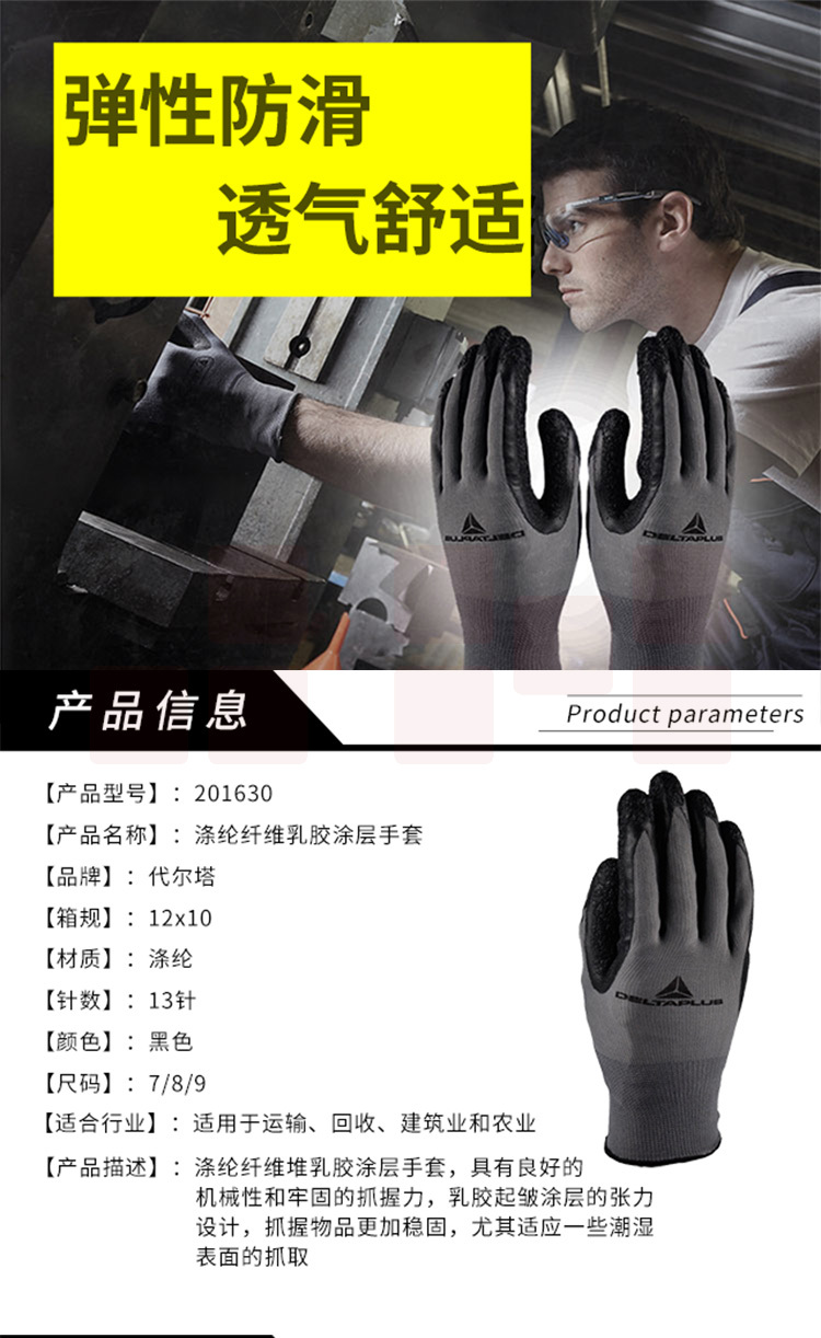 代尔塔 201630 乳胶涂层手套 涤纶防滑 透气 弹性 抓握性强 耐磨抗撕裂