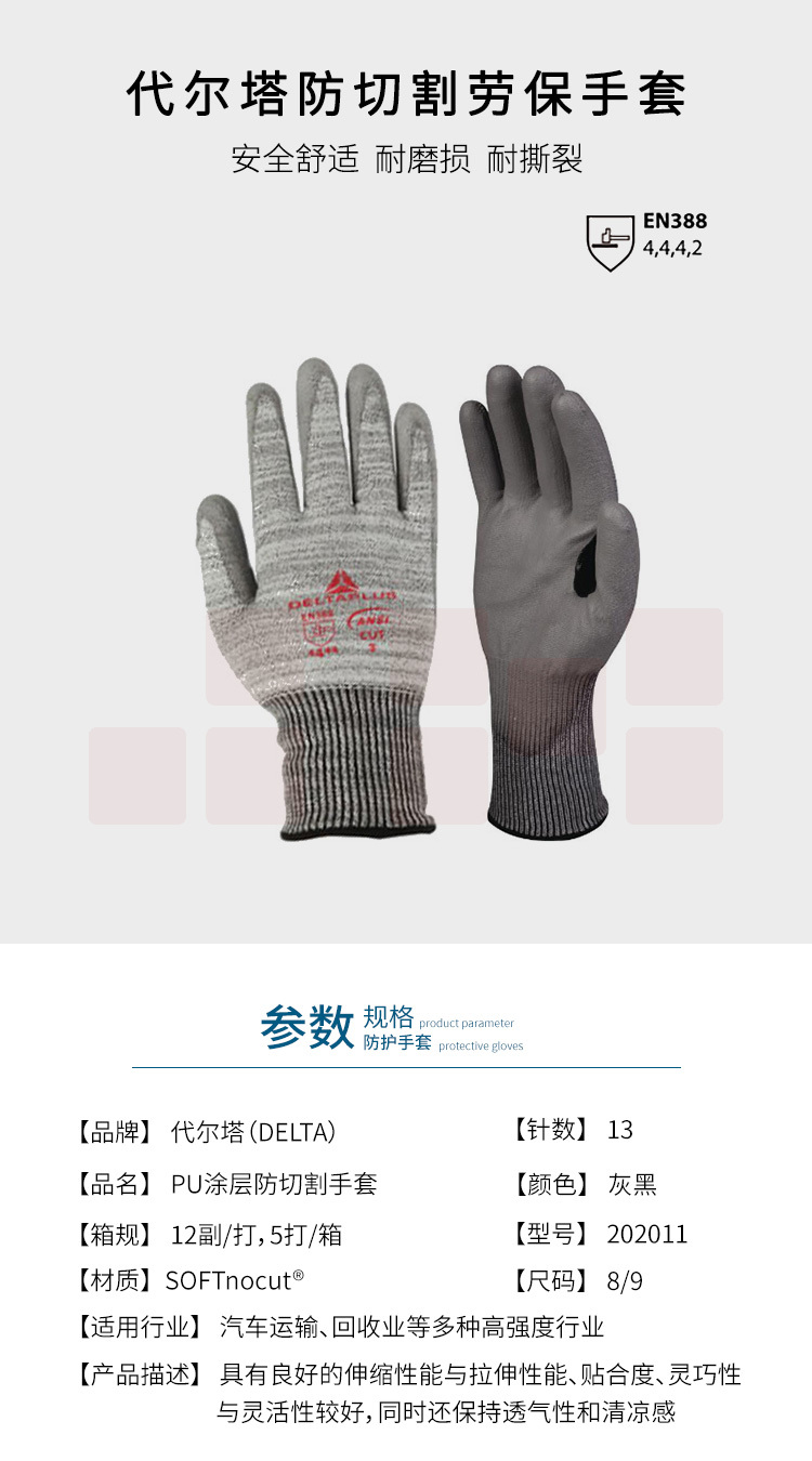 代尔塔 202011防切割手套 PU涂层TAEKI防割纤维透气劳保手套