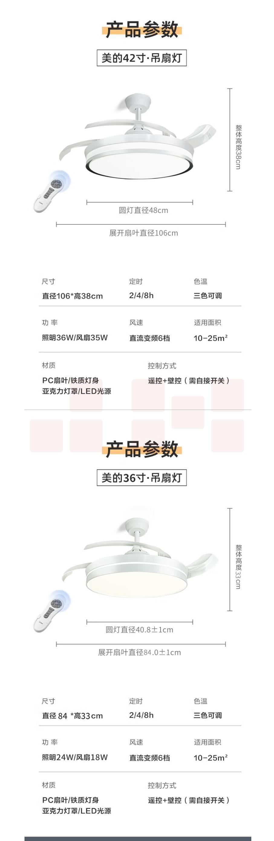 美的(Midea) 吊扇灯 餐厅隐形风扇 电扇灯遥控大风量LED风扇吊灯 FC105EERL 42寸遥控+三档调光+6档风速