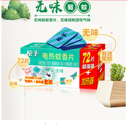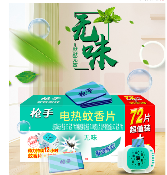 枪手 电热蚊香片套装 无导线 无味72片+1器 无香型 驱蚊 电蚊香