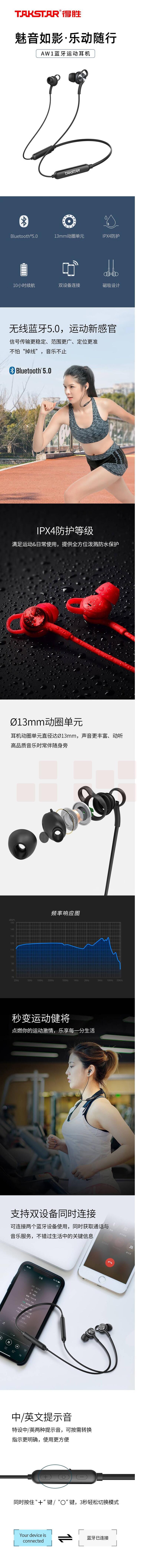 得胜(TAKSTAR) AW1 入耳式无线运动蓝牙耳机 手机耳机 磁吸入耳式耳机 音乐耳机 超长续航 黑色