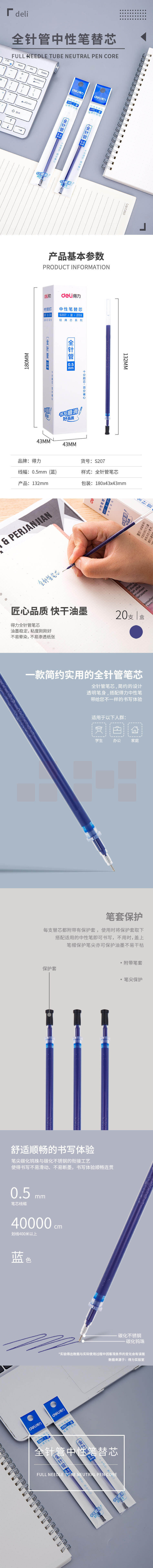 得力 S207 蓝色 0.5mm 中性笔笔芯 签字笔芯 拔帽笔芯 20支装