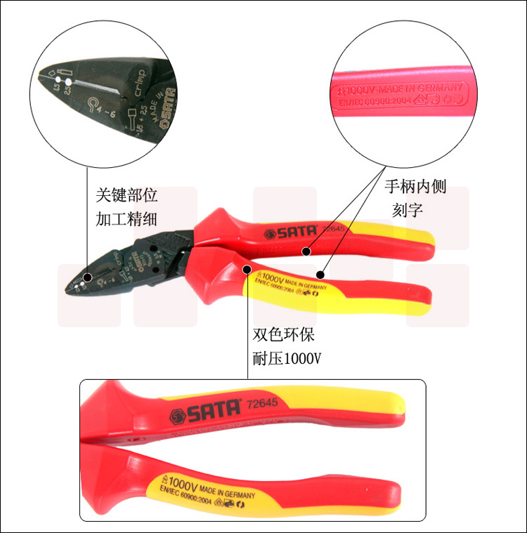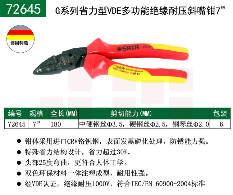 世达(SATA)G系列省力型VDE多功能绝缘耐压斜嘴钳7" 72645
