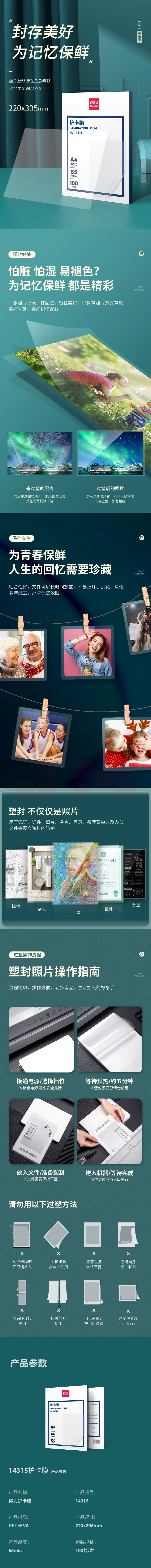 得力 A4护卡膜 文件塑封膜照片过塑膜220*305mm-100张 14315