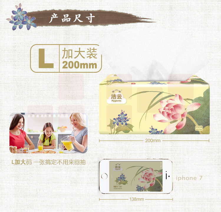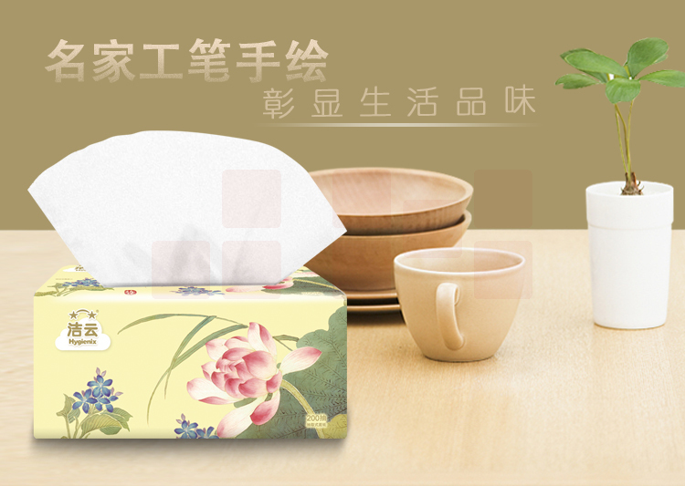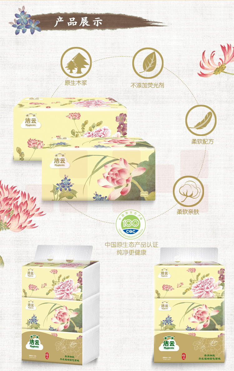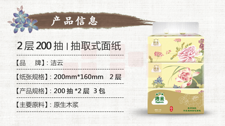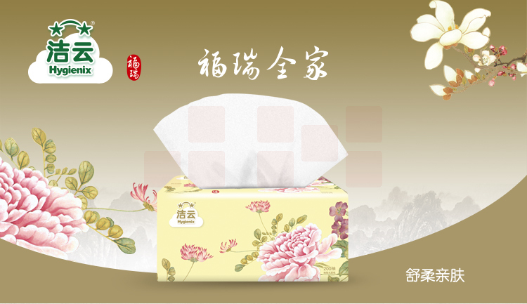 洁云抽纸 福瑞国色200抽 双层面巾纸3包/提 16提/箱