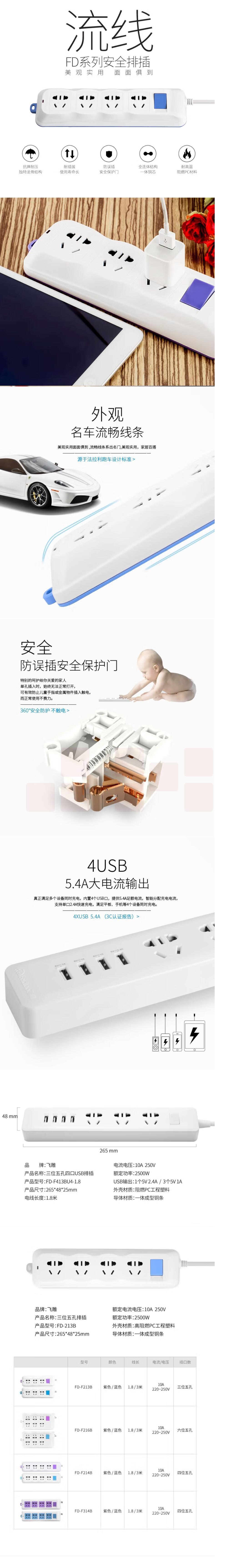 飞雕 接线板 6位总控1.8米 移动插排30孔插座FD-F216B 新国标袋保护门排插