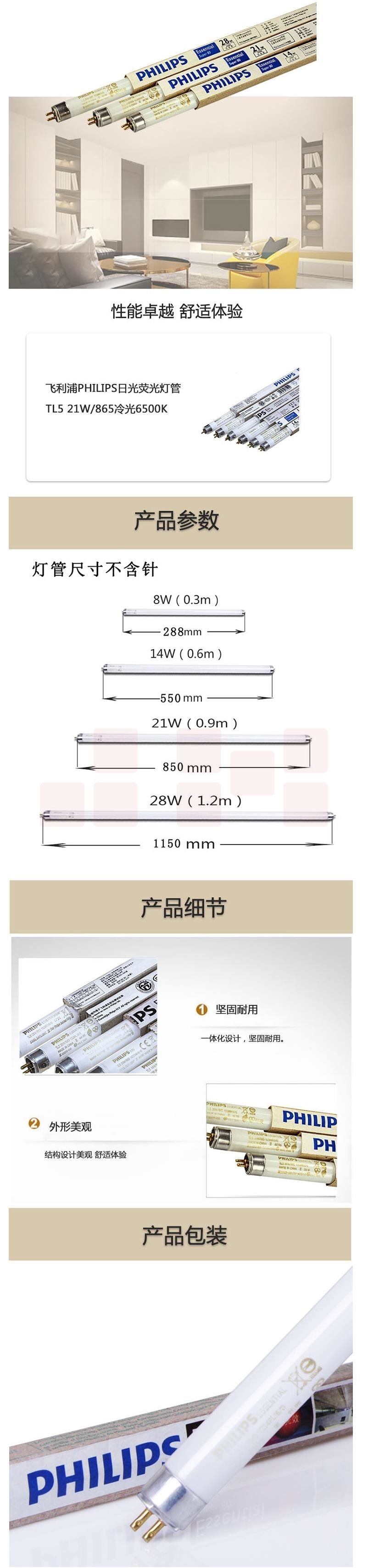 飞利浦 T5日光灯管 经济型三基色荧光灯管 21W 900mm 日光色6500K 40根/箱