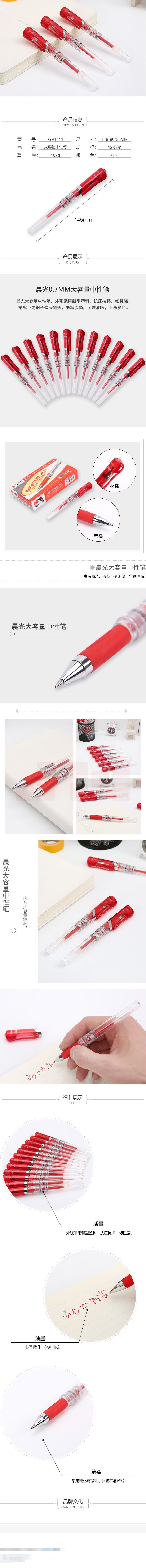 晨光GP1111/0.7mm红色中性笔 12支装 大容量拔盖子弹头练字签字笔