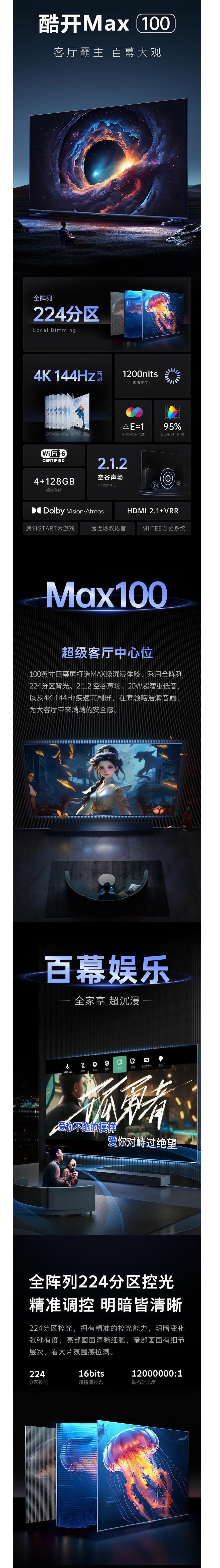 酷开创维Max100 100英寸电视1200nits峰值亮度 分区控光4+128G 144Hz