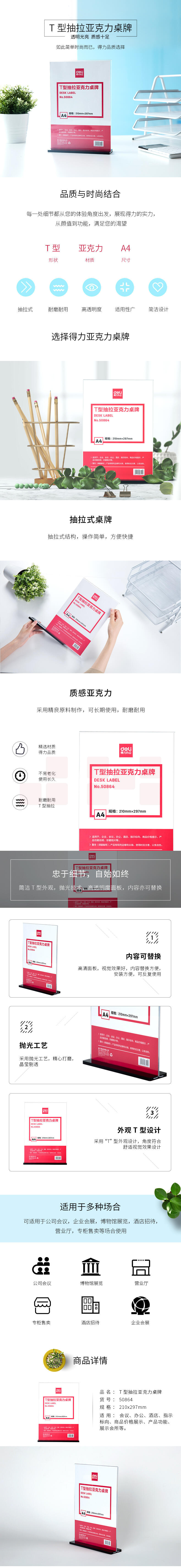 得力 T型桌牌 A4竖式抽拉亚克力桌牌/展示牌/台卡/酒水牌 50864