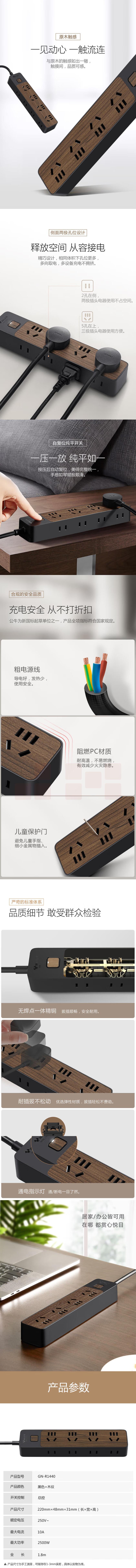 公牛GN-R1440 8位总控1.8米新国标插座/插线板/插排/排插/接线板/拖线板 黑色木纹