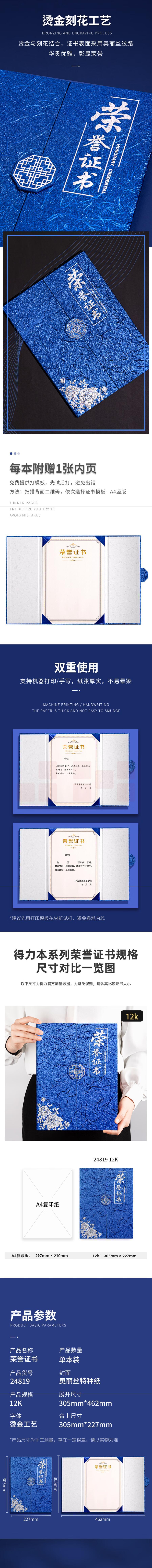 得力 12K荣誉证书 三折页设计 附内芯 蓝色24819