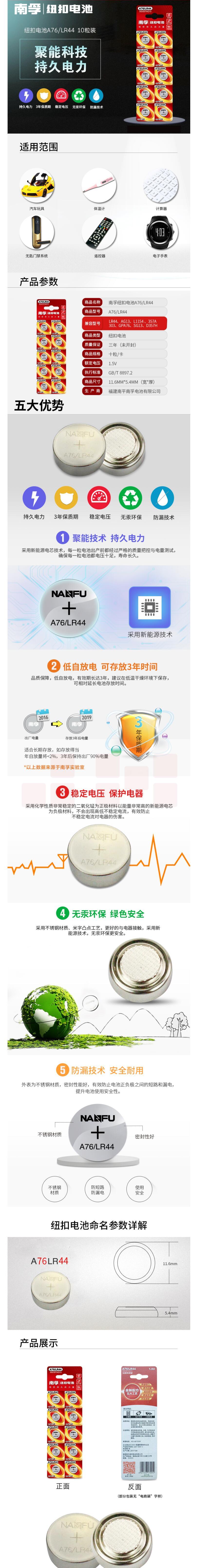 南孚纽扣电池10粒A76/LR44手表电池/计算器电池/电子玩具电池