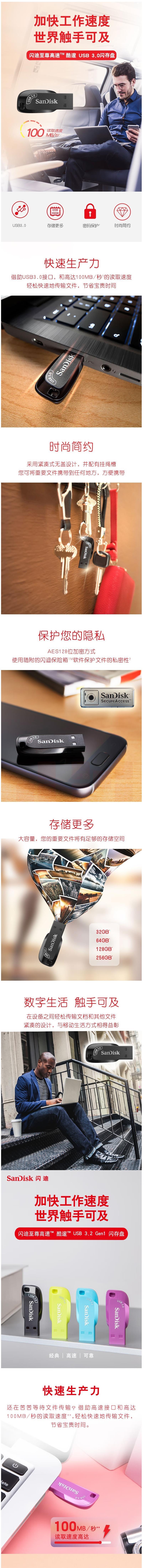 闪迪(SanDisk) U盘 CZ410 酷邃 高速USB3.0读取速度100MB/s 内置加密软件 时尚设计 学生优盘 商务办公 64GB 黑色