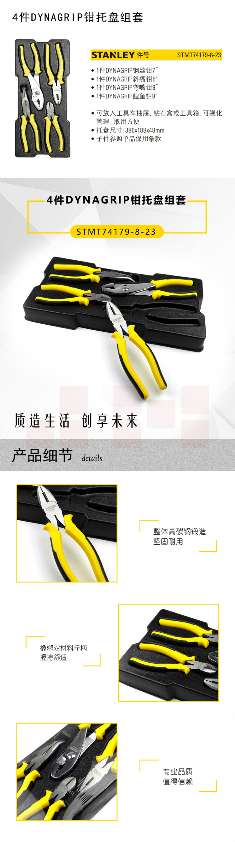 史丹利(STANLEY)4件DYNAGRIP钳托盘组套 钢丝钳 斜嘴钳 弯嘴钳 鲤鱼钳套装 STMT74179-8-23
