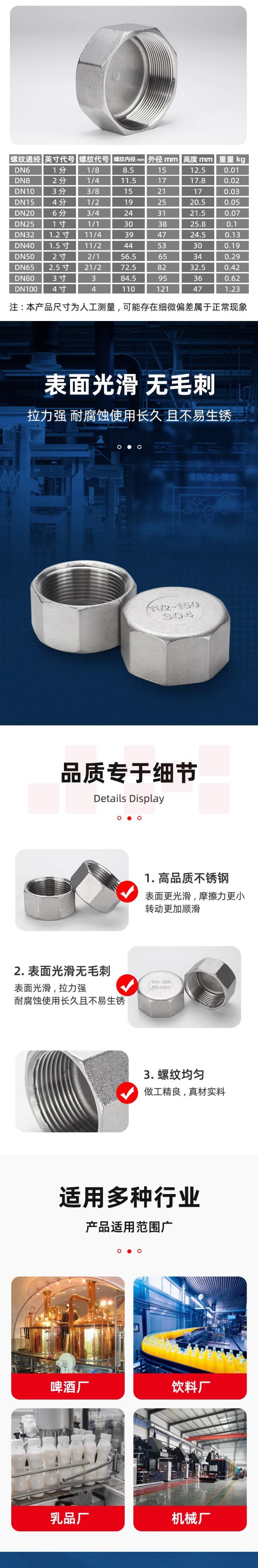 不锈钢六角管帽 内螺纹封头闷盖管堵头 DN20 货号:JC