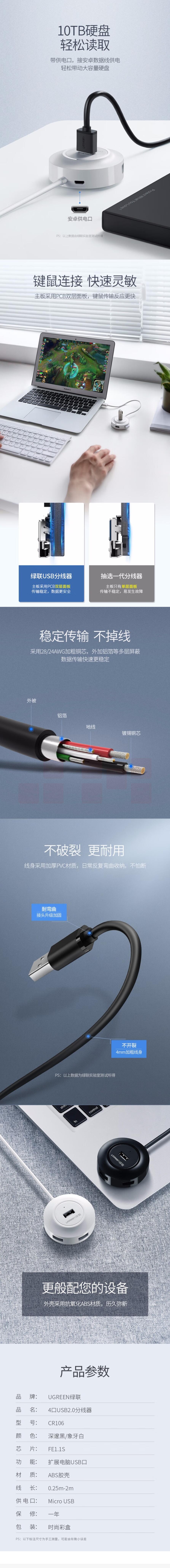 绿联 CR106 1.5米 USB2.0分线器4口带micro usb供电接口 Type-C笔记本一拖四转换器 黑色