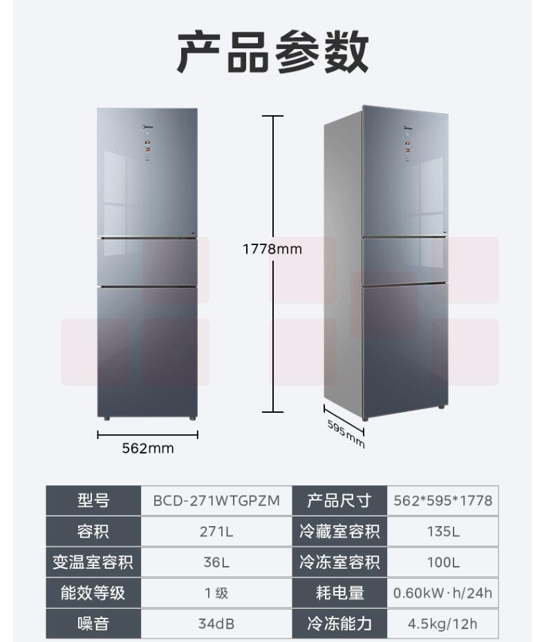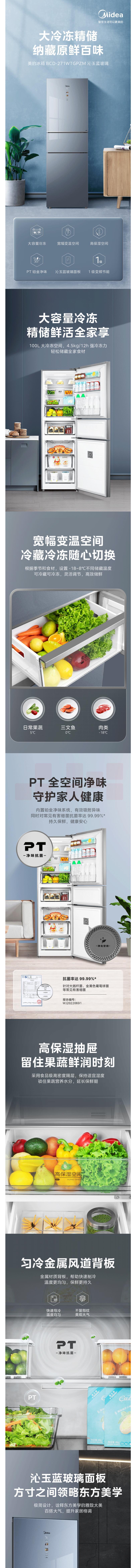 美的 271升三门冰箱 BCD-271WTGPZM 沁玉蓝