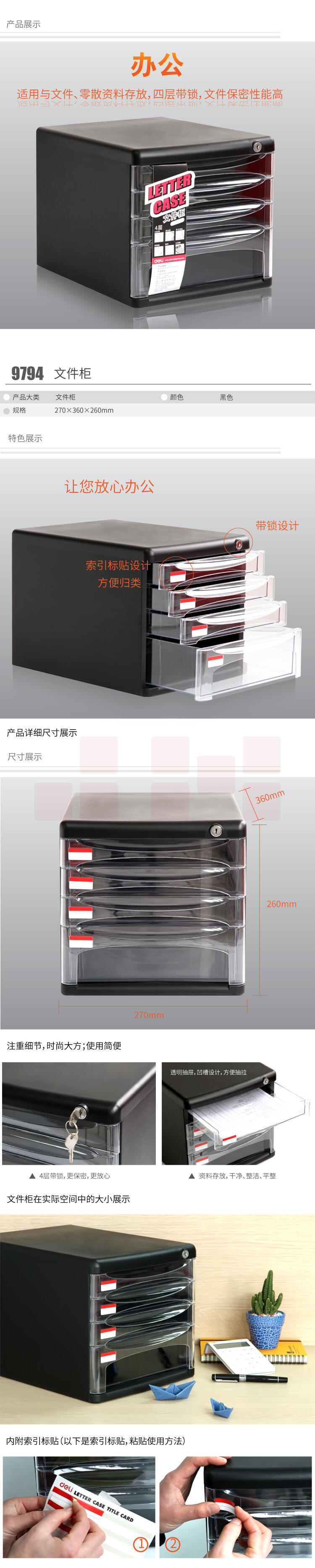 得力 9794 四层桌面文件整理收纳 361x271x260mm (黑)(只)