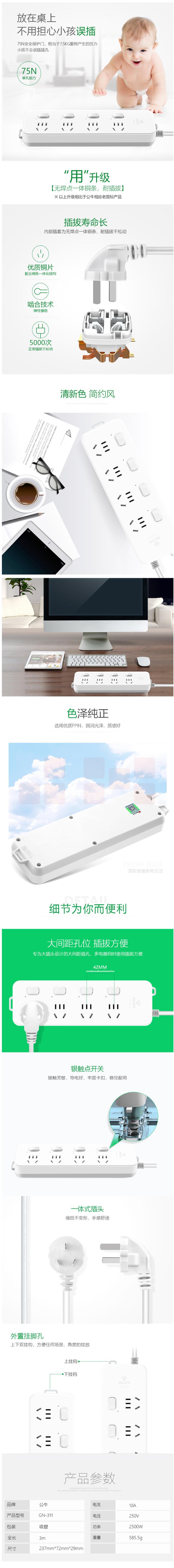 公牛GN-311排插3米全长 4位分控 超功率保护插座/插线板/插排/排插/接线板/拖线板