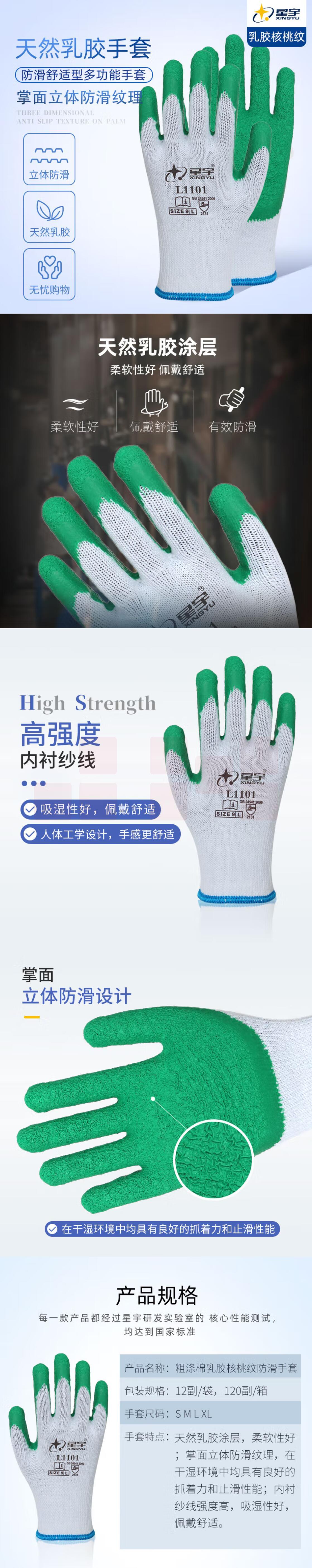 星宇L1101 纱线乳胶皱纹防滑手套 劳保手套12付/包