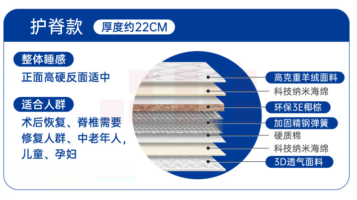 席梦思床垫 独立弹簧椰棕垫 (3E椰棕 精钢 羊绒面料) 厚度22cm 尺寸 1200mm*2000mm