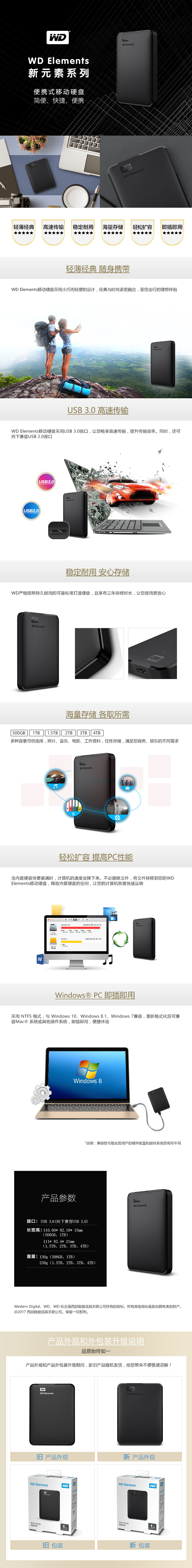 西部数据 1TB 移动硬盘 USB3.0 Elements 新元素系列 WDBUZG0010BBK
