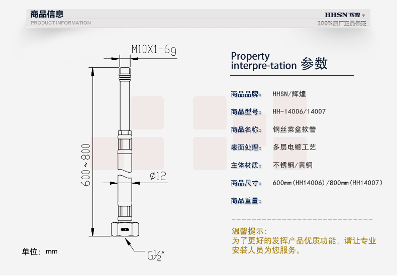 辉煌 (HHSN) 卫浴配件厨房菜盆面盆浴室不锈钢编织进水软管铜接口 HH14000-JS 长度600mm