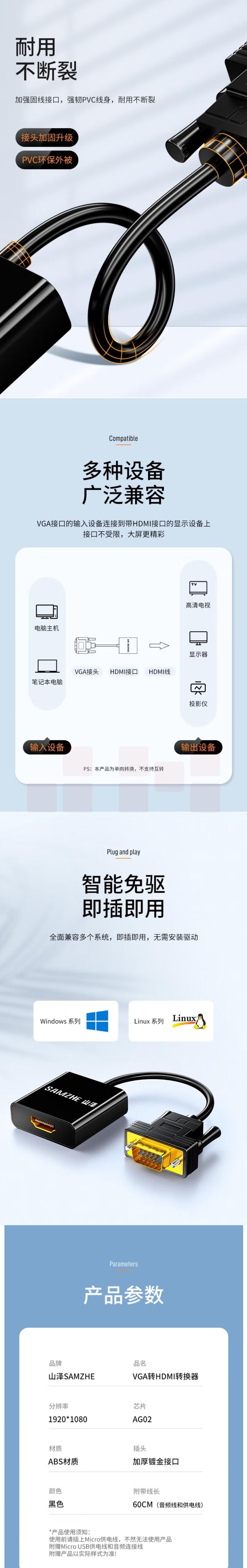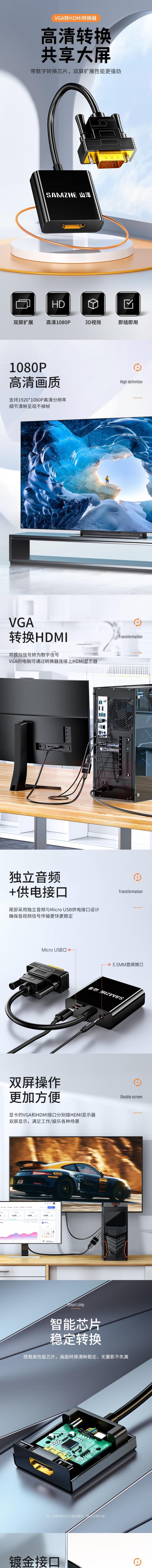 山泽 VGA转HDMI线转换器带音频 高清视频转接头 VH2018
