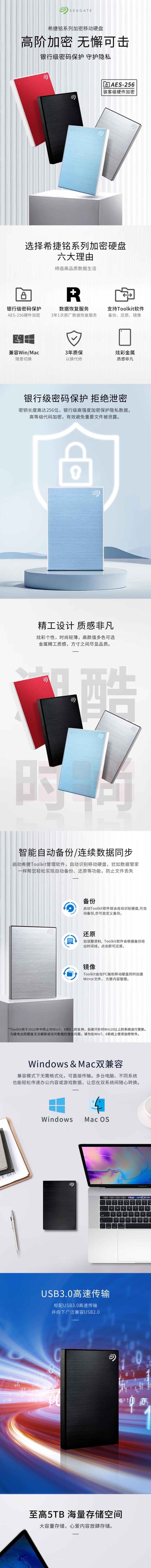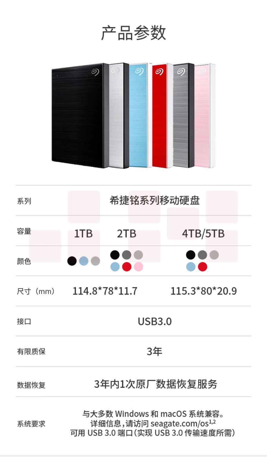 希捷 2TB移动硬盘 加密 USB3.0 希捷铭 2.5英寸 兼容Mac 红 STKY2000403