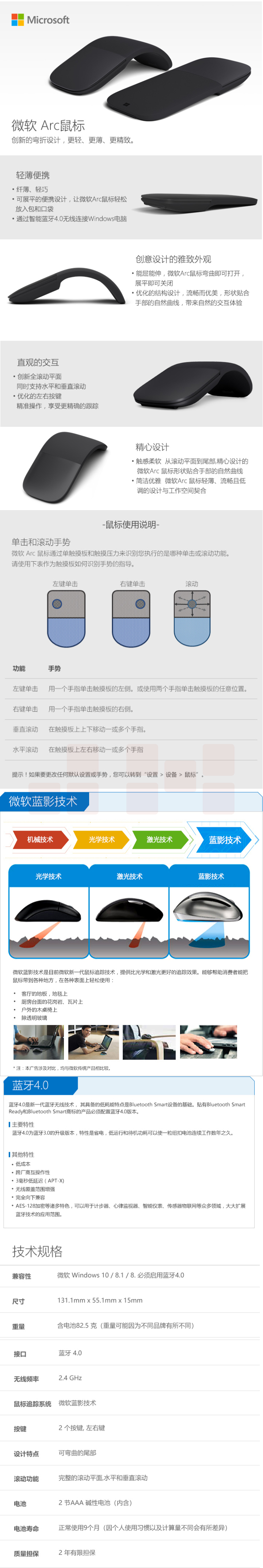 微软 Surface Arc蓝牙无线鼠标 轻薄便携可 办公鼠标(典雅黑)