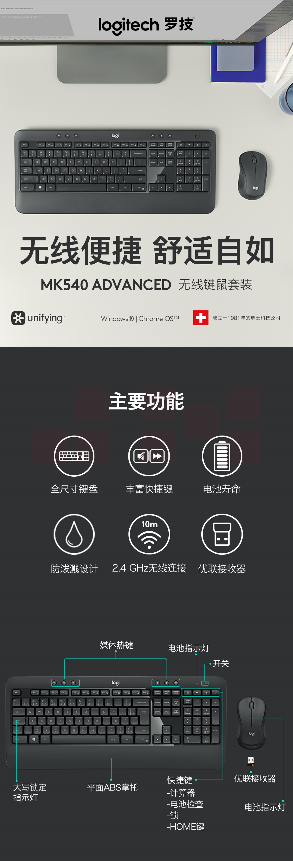 罗技(Logitech)MK540 无线键鼠套装 黑色 防泼溅 优联 舒适掌托