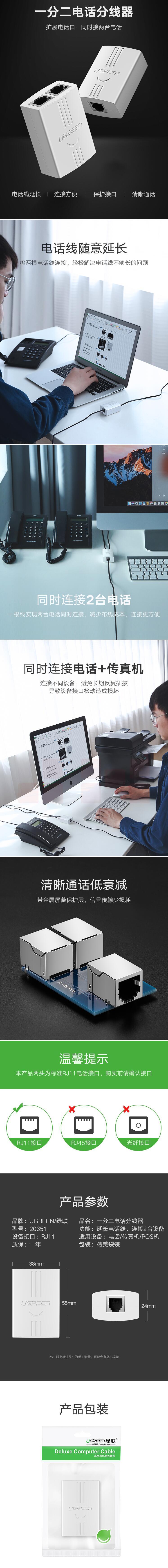 绿联 20351 白色 RJ11水晶头 电话一分二转接头