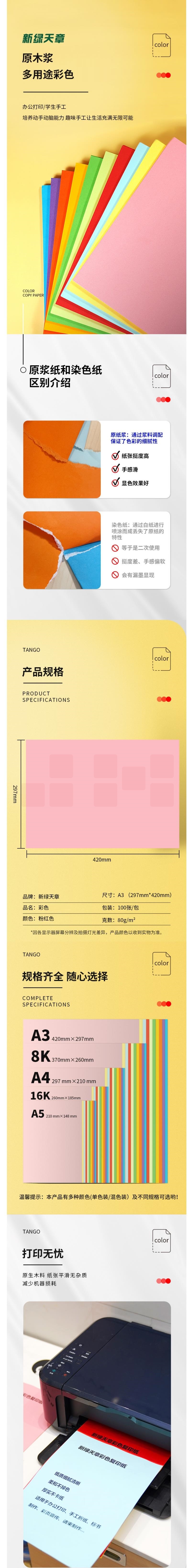 天章 A3 粉红色80g彩纸 多功能彩纸 彩色非硬卡纸 彩色手工DIY折纸剪纸 100张/包