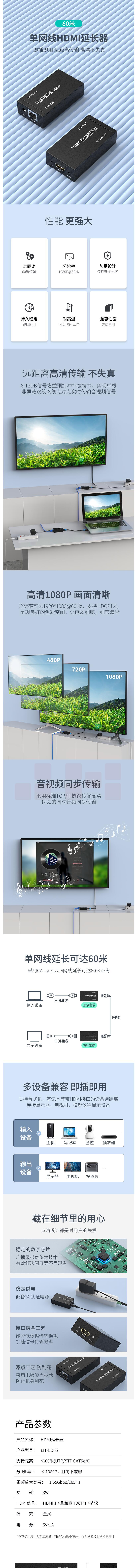 迈拓维矩MT-ED05 HDMI延长器 60米长网传RJ45放大器3D红外回传高清
