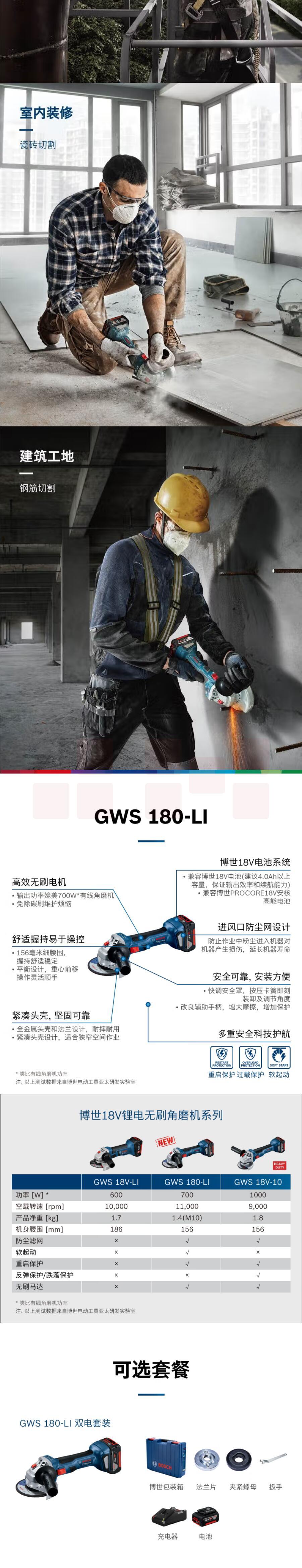 博世 GWS 180-LI 18V锂电角磨机切割机开槽机打磨机 4.0Ah电池 2块