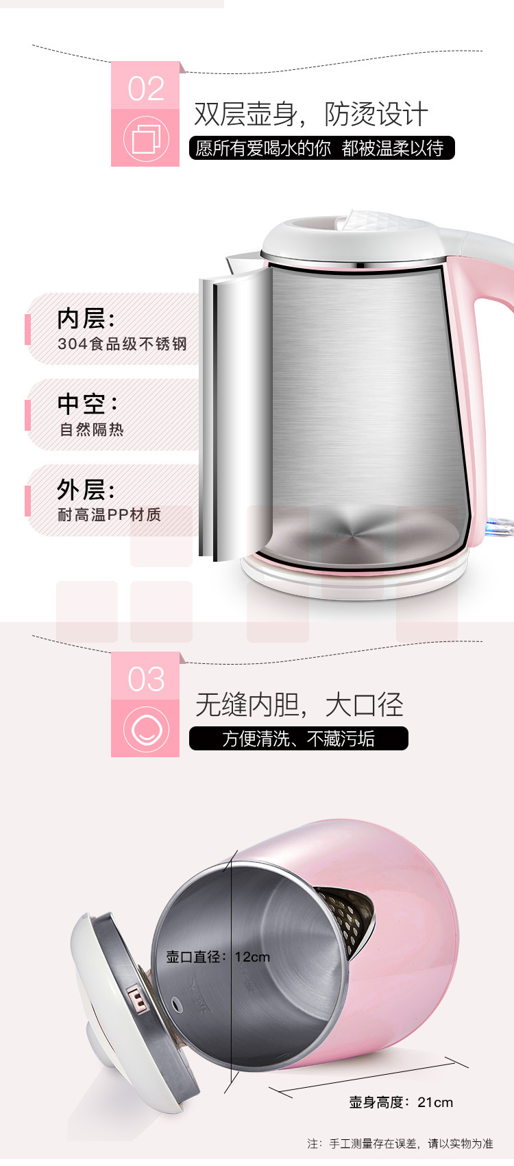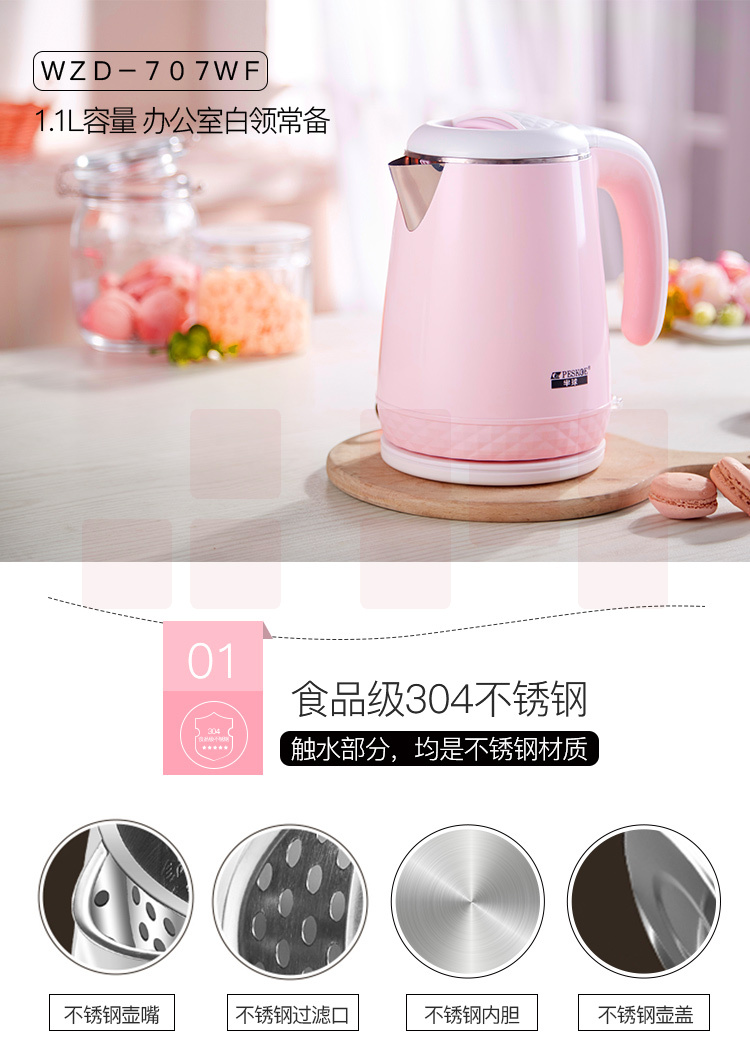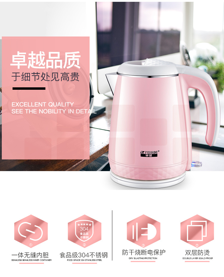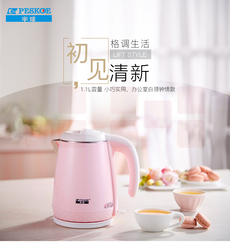 半球(Peskoe)电热水壶 304不锈钢 双层防烫烧水壶WZD-707WF 1.1L电水壶 无缝内胆