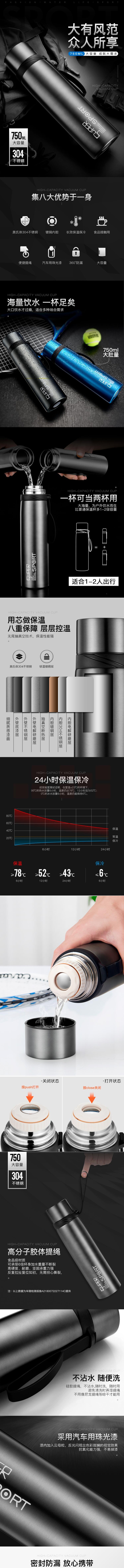 绿珠 750ml保温杯真空不锈钢保温杯K199黑灰色