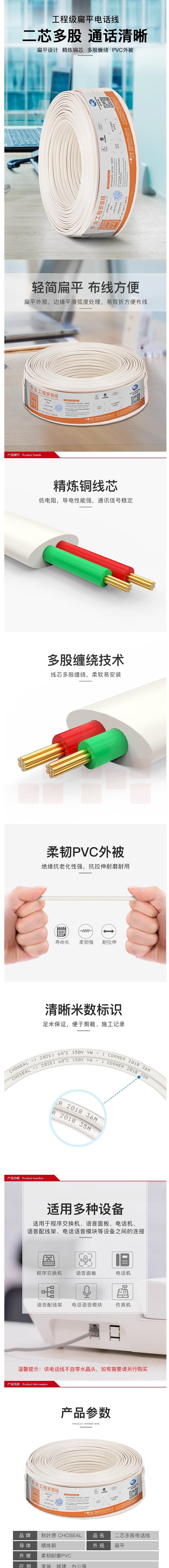 秋叶原(CHOSEAL)QS80T100S 2芯多股电话线 纯铜线芯 扁平线身线100米