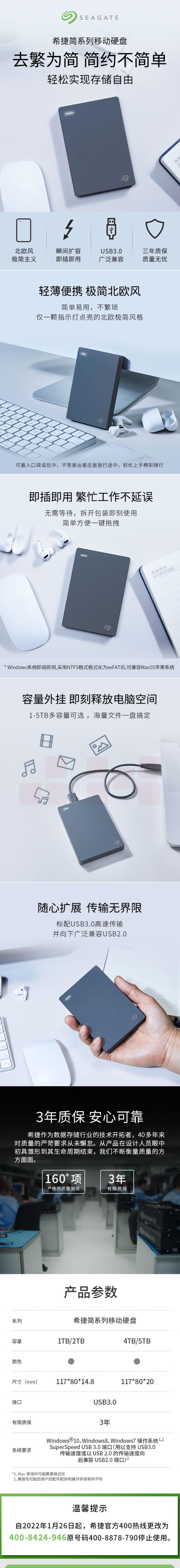 希捷 移动硬盘 2TB USB3.0 2.5英寸 便携 兼容PS4 STJL2000400