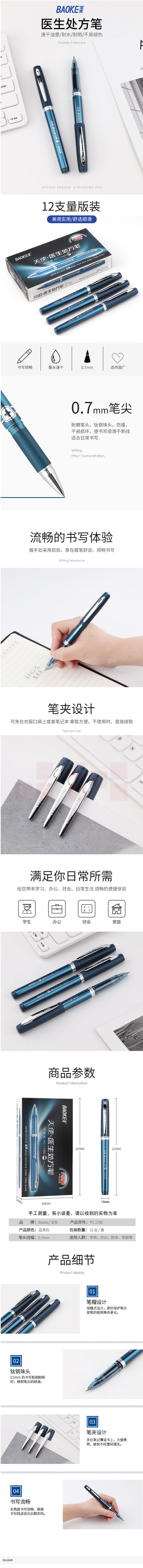宝克 PC1788医生处方笔12支 0.7mm中性笔墨蓝水笔