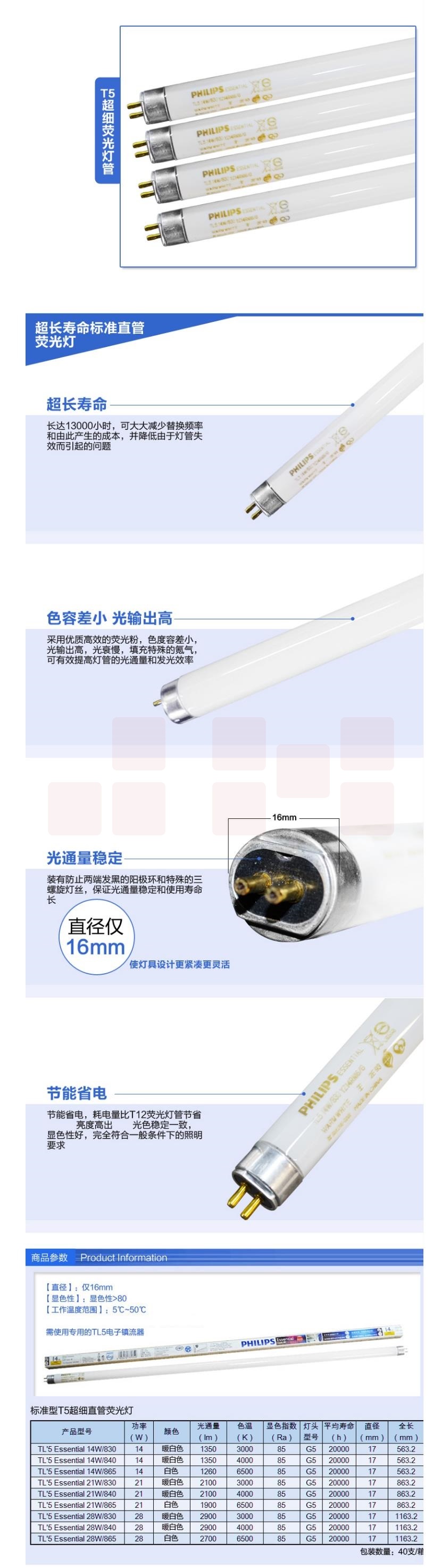 飞利浦 T5标准灯管日光灯管荧光灯管 ES 28W 4000K
