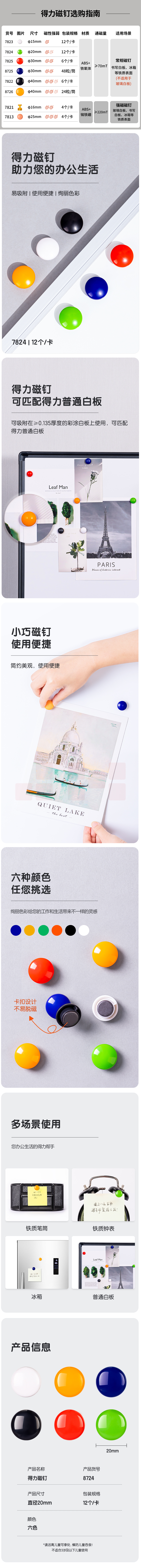 得力 7824磁钉 白板配件 固定磁扣 小磁铁 20mm 12个/卡