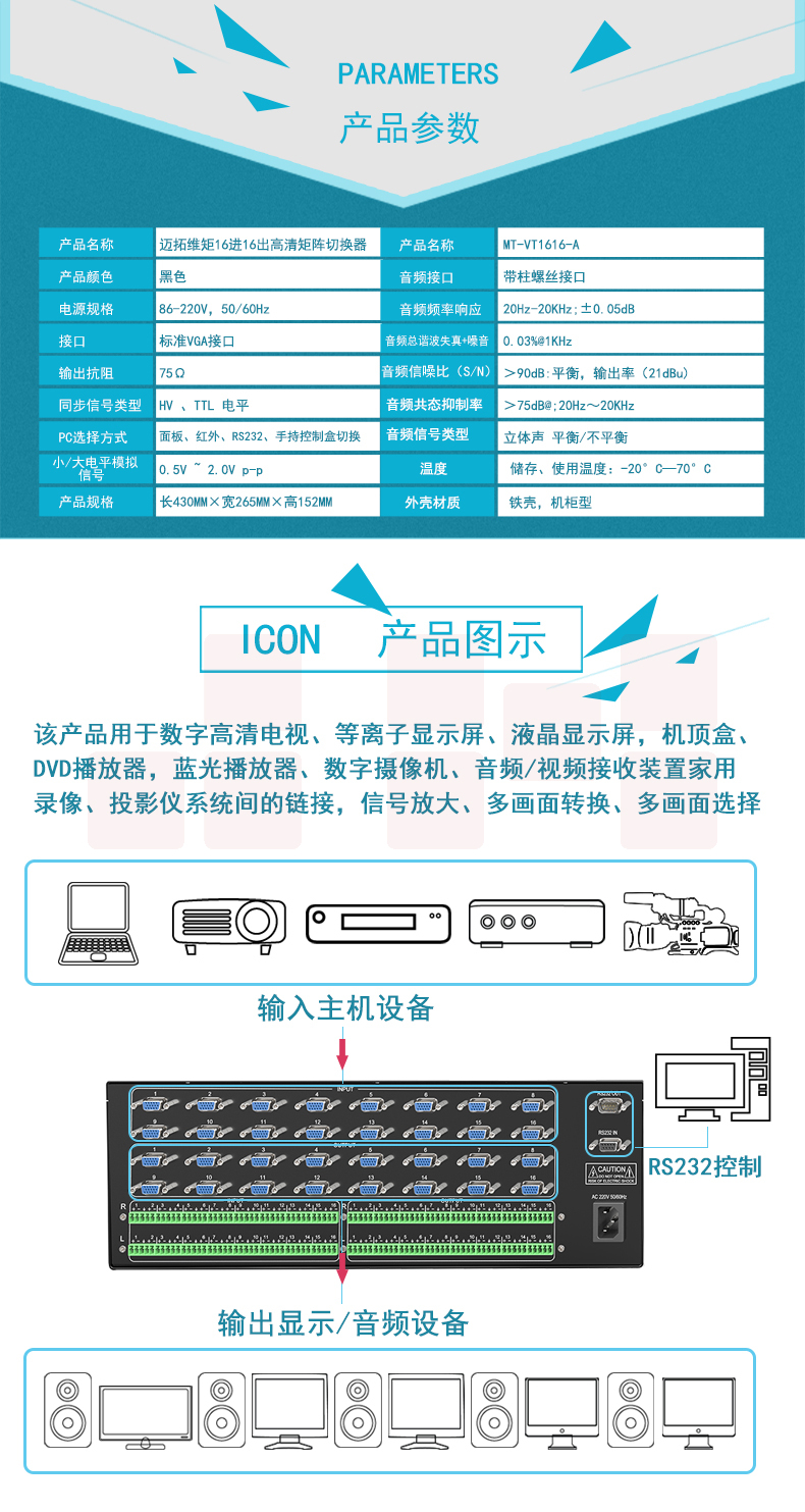 迈拓维矩MT-VT1616A vga矩阵切换器带音频16进16出高清监控音频视频切换器