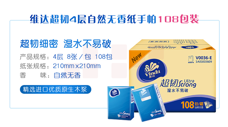 维达(Vinda) 超韧4层手帕纸*36包1袋 108包1箱 整箱销售