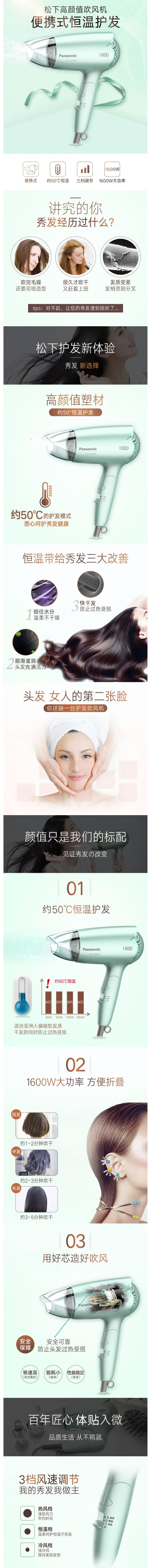 松下(Panasonic)电吹风机大功率1600W 高速大风力速干折叠便携 吹发护发电吹风筒 EH-WND2G 货号:JC