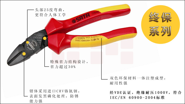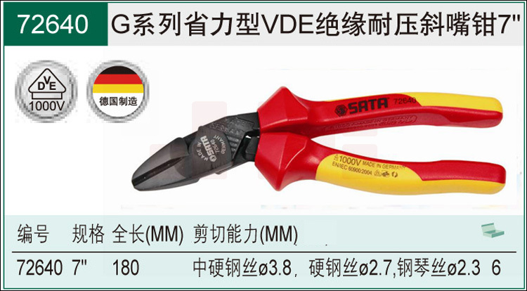 世达(SATA)G系列省力型VDE绝缘耐压斜嘴钳7"货号 72640